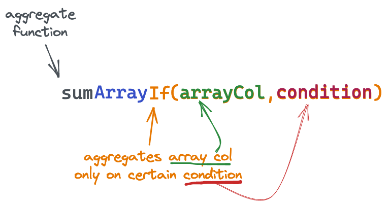 SELECTarticle_id,sumArrayIfOrNull(times, length(sections) > 8)FROM article_readsGROUP BY article_id┌─article_id─┬─sumArrayOrNullIf(times, greater(length(sections), 8))─┐│ 14 │ 4779 ││ 18 │ 3001 ││ 19 │ NULL │...│ 17 │ 14424 │└────────────┴───────────────────────────────────────────────────────┘