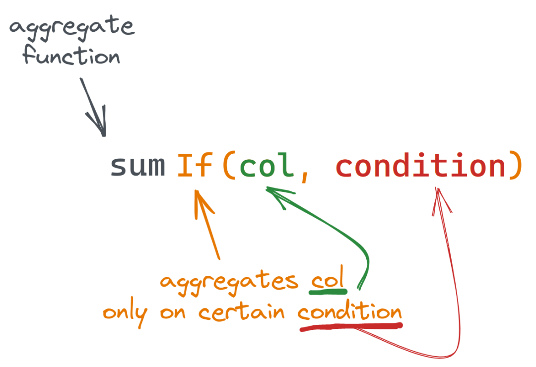 要使用组合器,我们需要做两件事。首先,选择我们想要使用的聚合函数;假设我们想要使用 sum() 函数。其次,选择我们案例所需的组合器;假设我们需要一个 If 组合器。要在查询中使用它,我们将组合器添加到函数名称中: