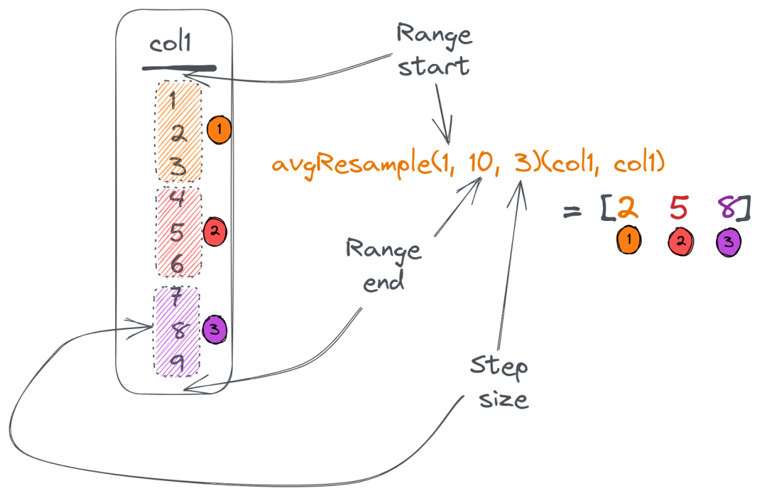 要以表格布局获取 Resample() 组合器的输出,我们可以使用 arrayZip() 和 arrayJoin() 函数: