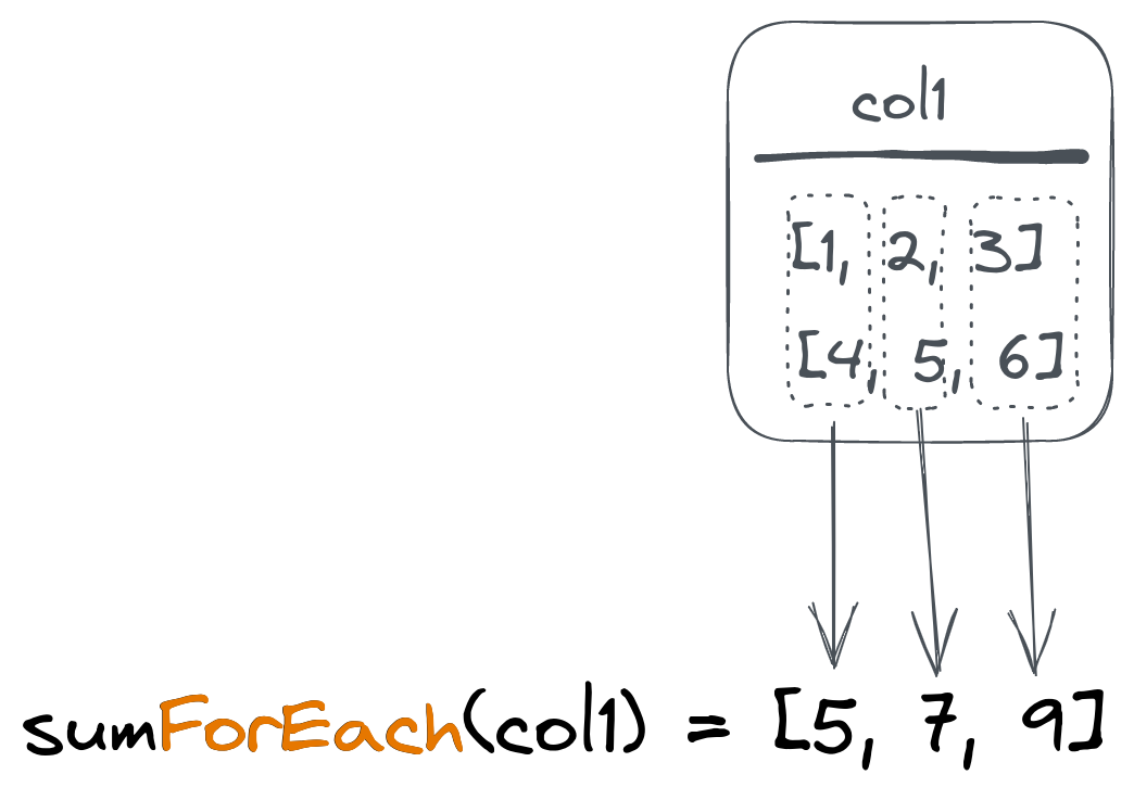 另一种处理数组列的方法是从两个数组中聚合相应的值。这将产生另一个数组。这可以用于矢量化数据(如向量或矩阵),并通过 ForEach() 组合器实现: