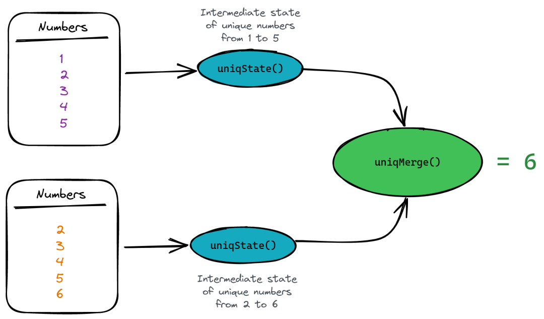 SELECT uniqMerge(u)FROM(SELECT uniqState(number) AS u FROM numbers(5)UNION ALLSELECT uniqState(number + 1) AS u FROM numbers(5))┌─uniqMerge(u)─┐│ 6 │└──────────────┘