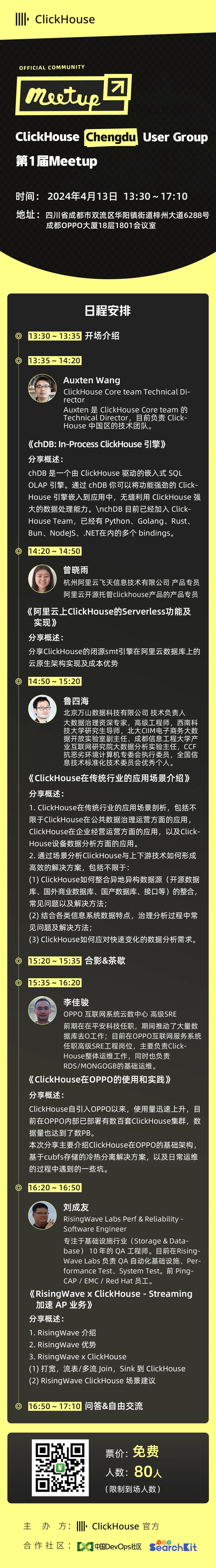 好消息:ClickHouse Chengdu User Group第1届 Meetup 已经开放报名了,将于2024年4月13日在成都市双流区华阳镇街道梓州大道6288号成都OPPO大厦18层1801会议室举行,扫码免费报名