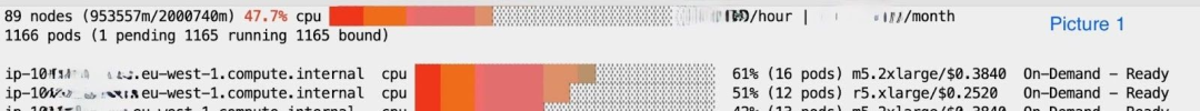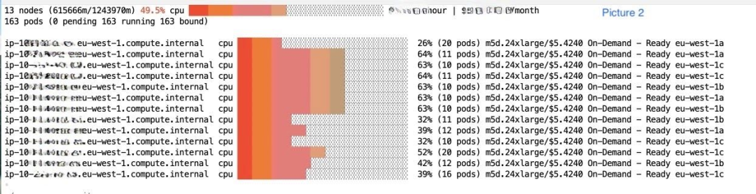 图片 1 显示了我们一个较大的 EKS 集群中的 CPU 利用率百分比。整个集群的 CPU 利用率约为 50%。此外,许多大型和昂贵的节点(如图片 2 所示)未被充分利用。根据我们集群的 eks-node-viewer 结果,我们得出结论,服务器 pod 在节点之间没有被稠密地分配。本应安排在同一节点上的两个 ClickHouse pod 却被安排在不同的节点上,导致我们需要更多的 EC2 节点来承载相同数量的 pod,节点的资源利用率降低,并且机群成本更高。我们集群中的许多节点上的 CPU/内存资源大多处于空闲状态,但我们仍在为这些节点付费。