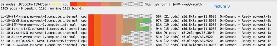 为了使我们的资源消耗尽可能高效,我们进行了一项测试,以确定我们的 pod 是如何分配的。我们分析了我们的 EKS 集群节点的 CPU/内存利用率。下面的截图来自 eks-node-viewer,这是一个可视化 EKS 资源利用率的工具。