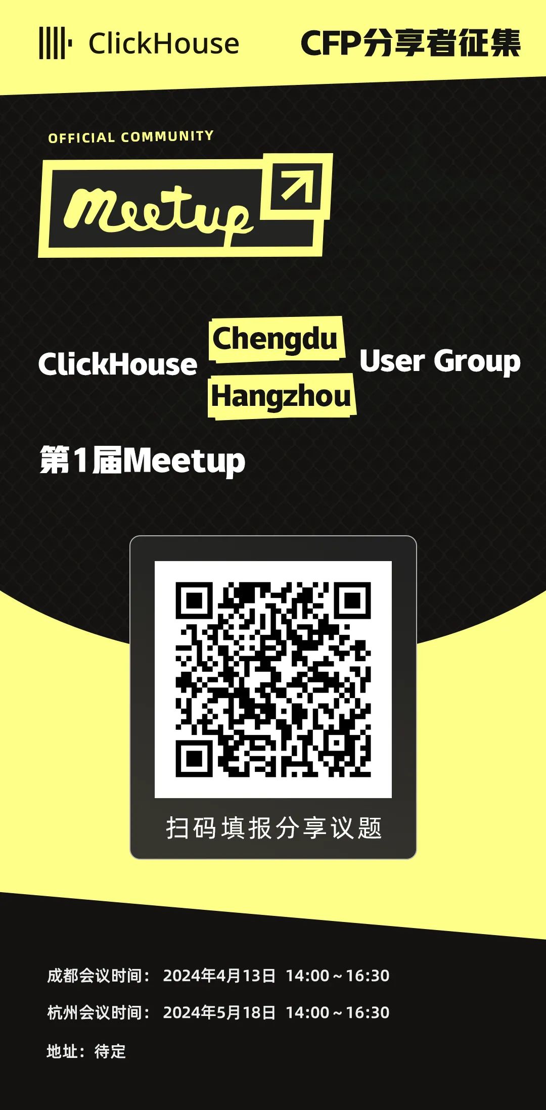 ClickHouse 成都和杭州首届 Meetup 讲师招募中,欢迎讲师在文末扫码报名!
