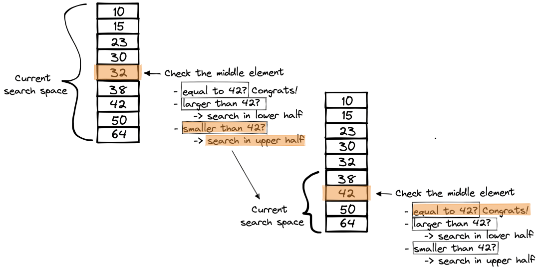 例如,考虑下面的排序数组,二分查找算法用于查找值42。该算法将目标值42与数组的中间元素进行比较。如果它们不相等,则排除目标不可能存在的半部分,并且在剩余的半部分上继续搜索,再次将中间元素与目标值进行比较,并重复此过程,直到找到目标值: