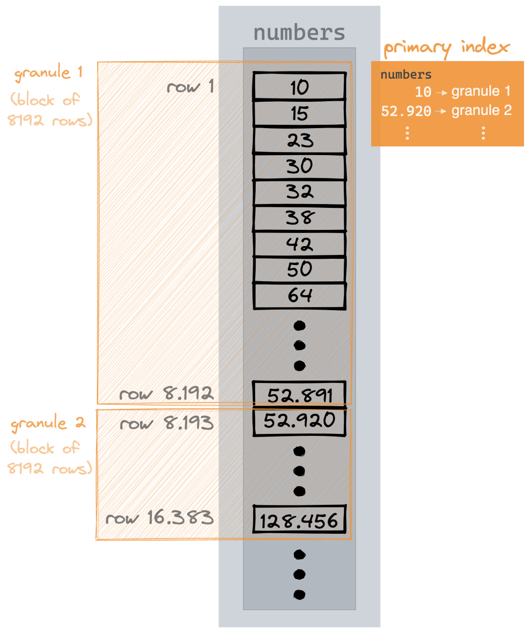 根据行的顺序,主索引(像上面的图表一样是排序的数组)存储来自表的第8192行的主键列值。