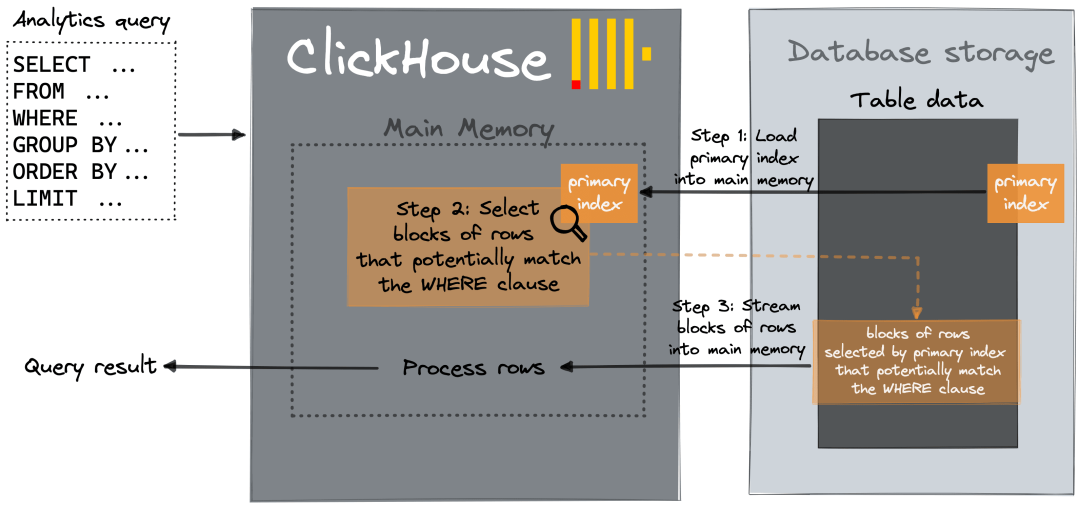 如第一段所述,为了执行查询,ClickHouse 首先使用主索引来选择可能包含与查询的 WHERE 子句匹配的行的块。
