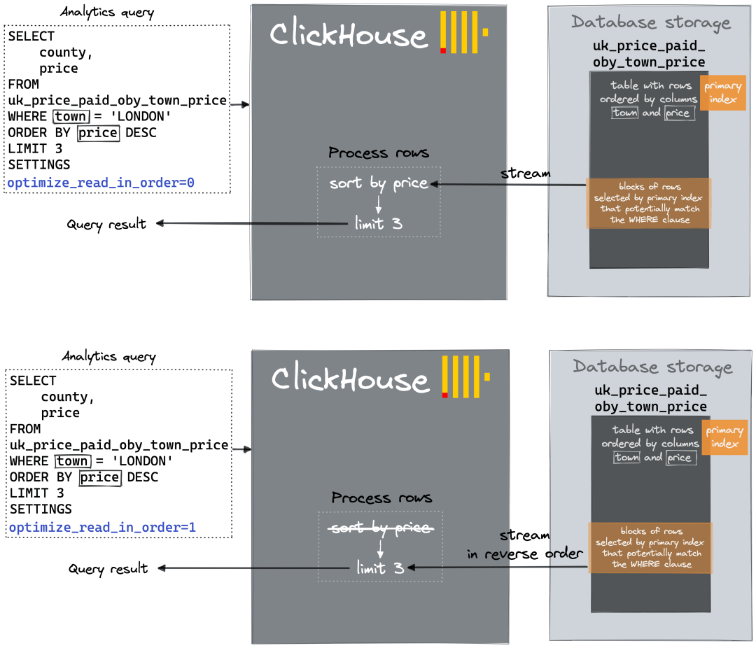 optimize_read_in_order设置可以通过查询的SETTINGS子句禁用。这将导致ClickHouse从磁盘上流出217万行而不是8192行(仍然优于全表扫描)。以下图表显示了查询处理步骤的差异: