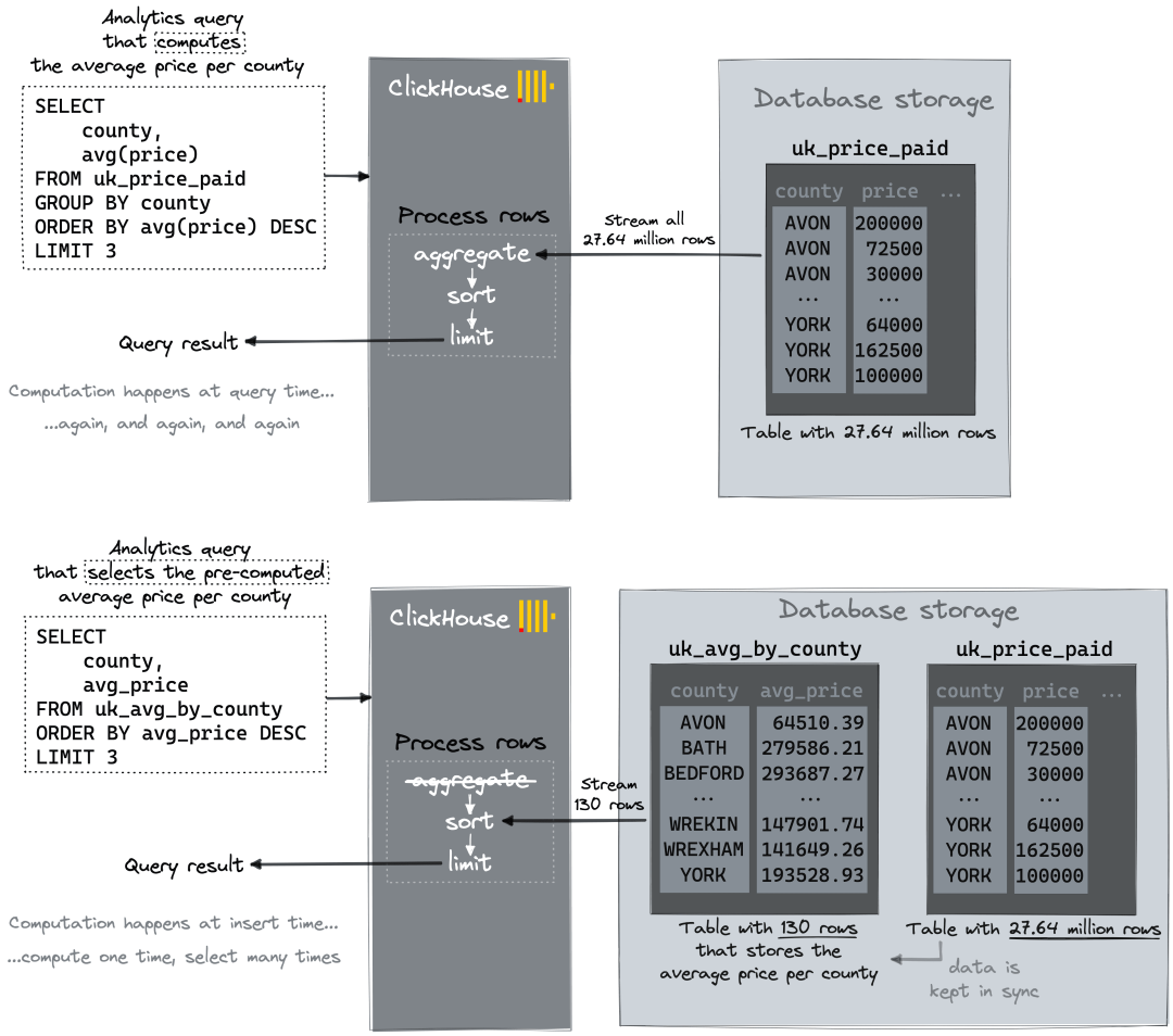 然而,如果我们可以为所有现有的 130 个英国县预先计算聚合值并在原始表数据更改时更新该单独的表,就可以大大减少从磁盘流入的数据量(通过牺牲额外的磁盘空间)。