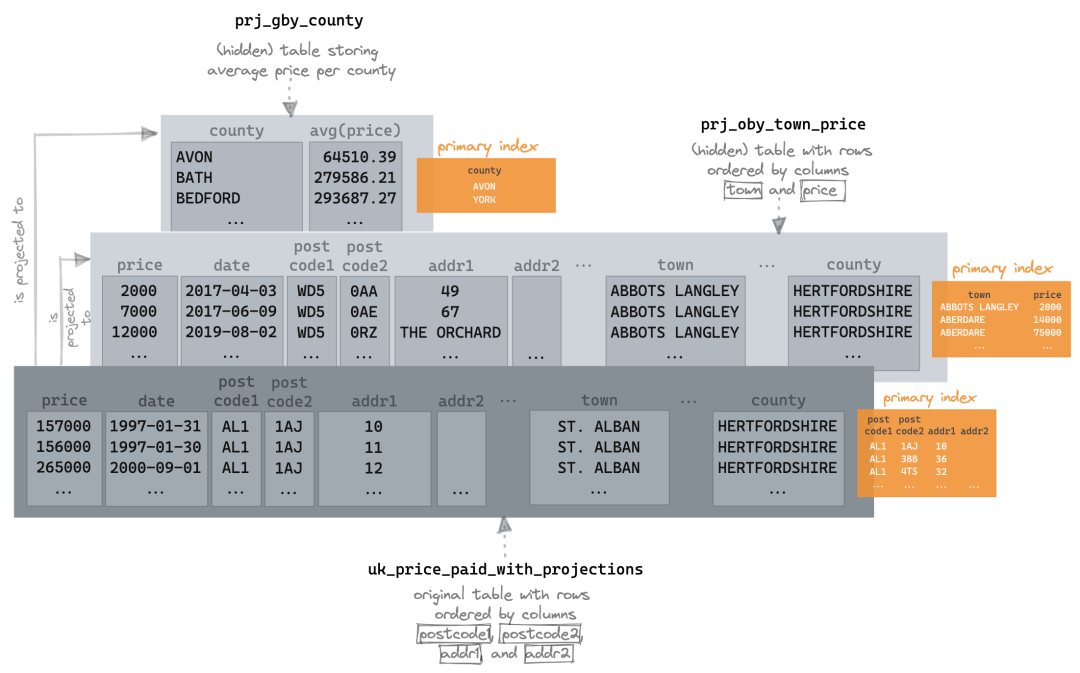 这是主表 uk_price_paid_with_projections 及其两个投影的可视化: