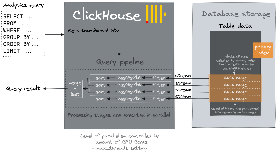 数据的流式传输和实际处理可以通过(3)提高ClickHouse查询处理引擎内部使用的并行度来加快速度。