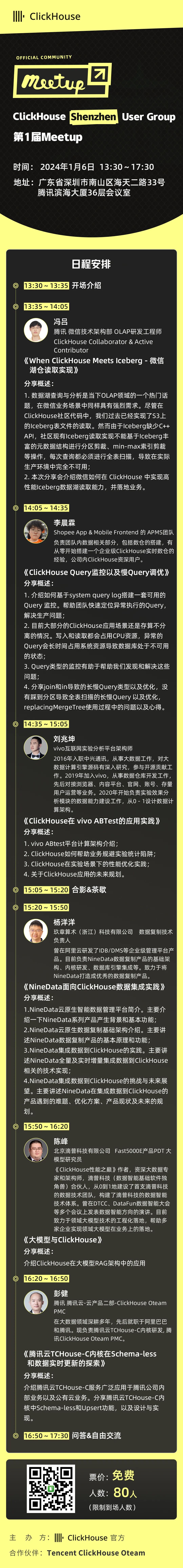 好消息:ClickHouse Shenzhen User Group第1届 Meetup 已经开放报名了,将于2024年1月6日在深圳南山区海天二路33号腾讯滨海大厦举行,扫码免费报名