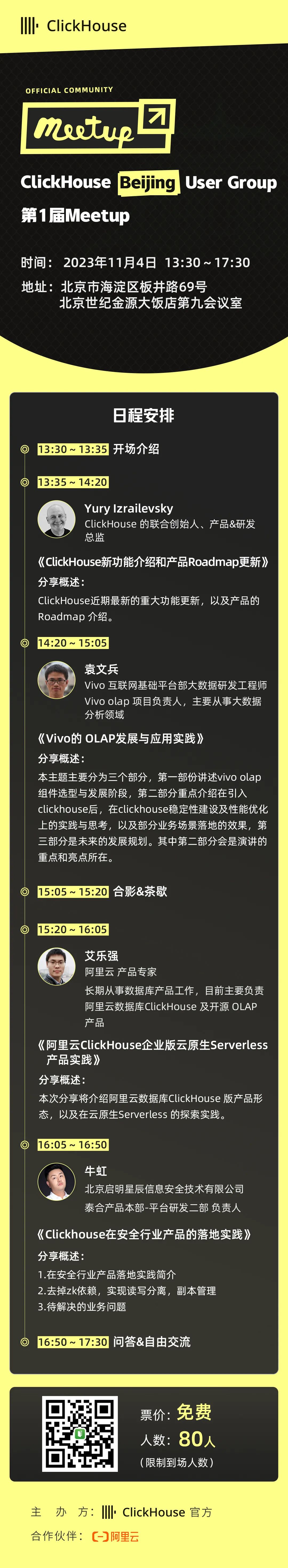 好消息:ClickHouse Beijing User Group第1届 Meetup 已经开放报名了,将于11月4日在北京世纪金源大饭店第九会议室人举行,扫码免费报名