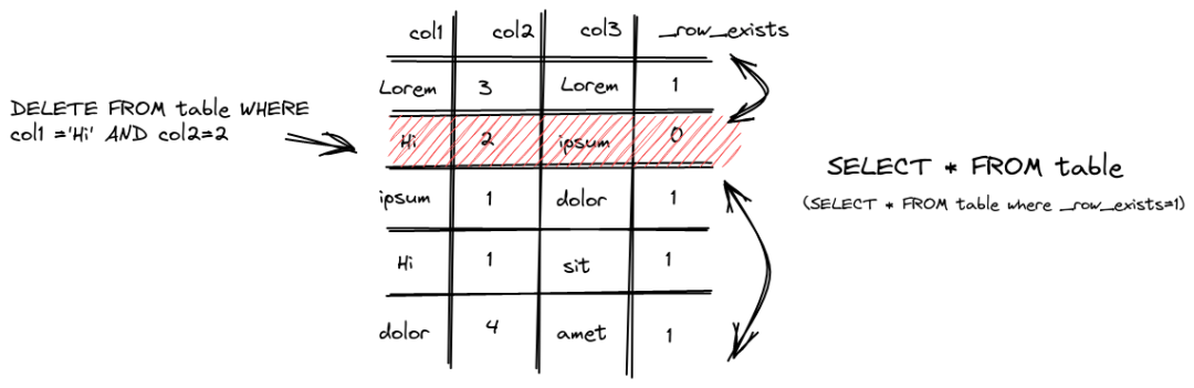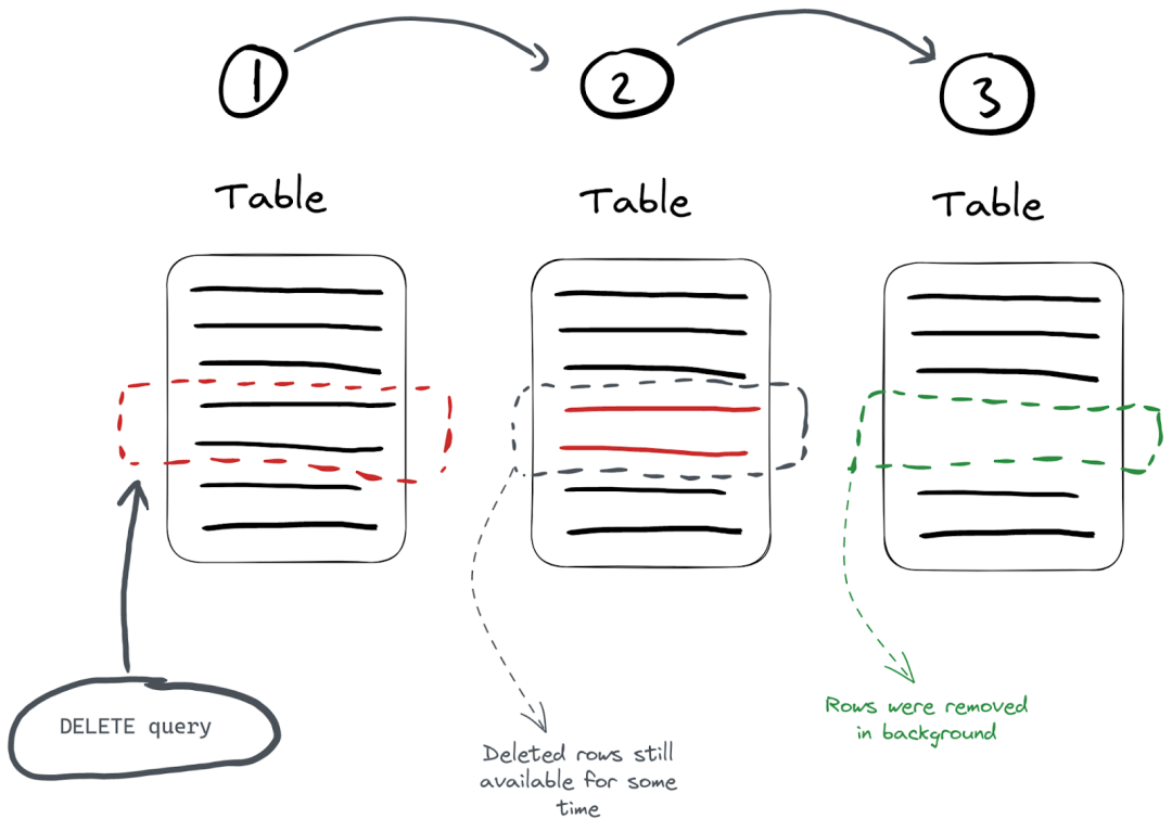 默认情况下,此操作是异步的,除非将 mutations_sync 设置为1(参见下文)。执行删除时,ClickHouse 为每一行保存一个掩码,表示在 _row_exists 列中是否已删除它。随后的查询则排除了那些被删除的行,如下所示。