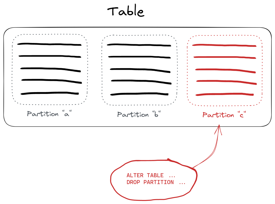 通过按 project 列分区此表,我们可以通过删除整个分区来删除具有特定 project 值的行。让我们删除 project = c 的所有内容: