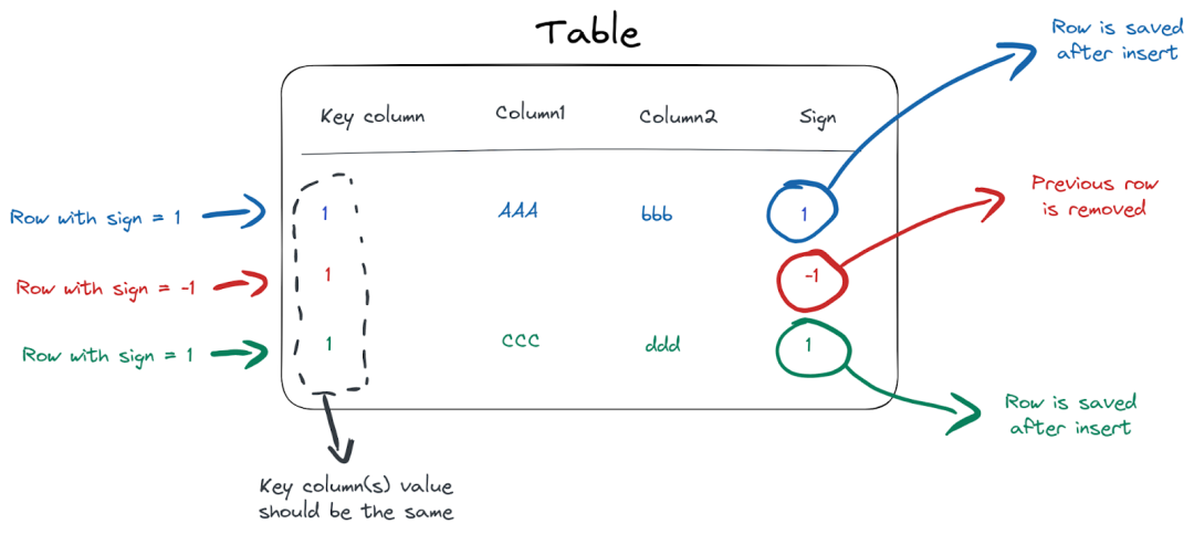 特殊的 sign 列用于 CollapsingMergeTree,作为告诉ClickHouse我们想要更新特定行的方式。如果我们为 sign 列插入-1,则整行都将被删除。如果我们插入 sign = 1 的行,ClickHouse将保留该行。要更新的行基于在创建表时用 ORDER BY () DDL 语句使用的排序键来识别: