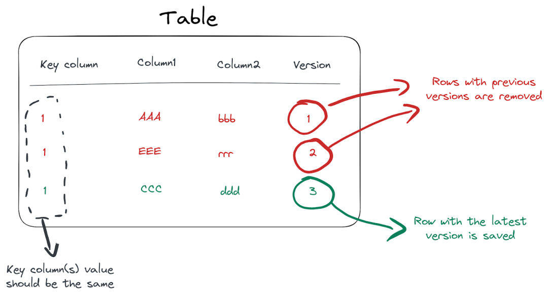 对于更复杂的情况,我们可能希望使用基于ReplacingMergeTree引擎的版本控制。这个引擎实现了在其他数据库管理系统中称为 UPSERT 的有效方式,通过使用一个特殊的版本列来跟踪哪些行应该被移除。如果存在具有相同排序键的多个行,则只保留版本最大的那个行,而其他行被移除: