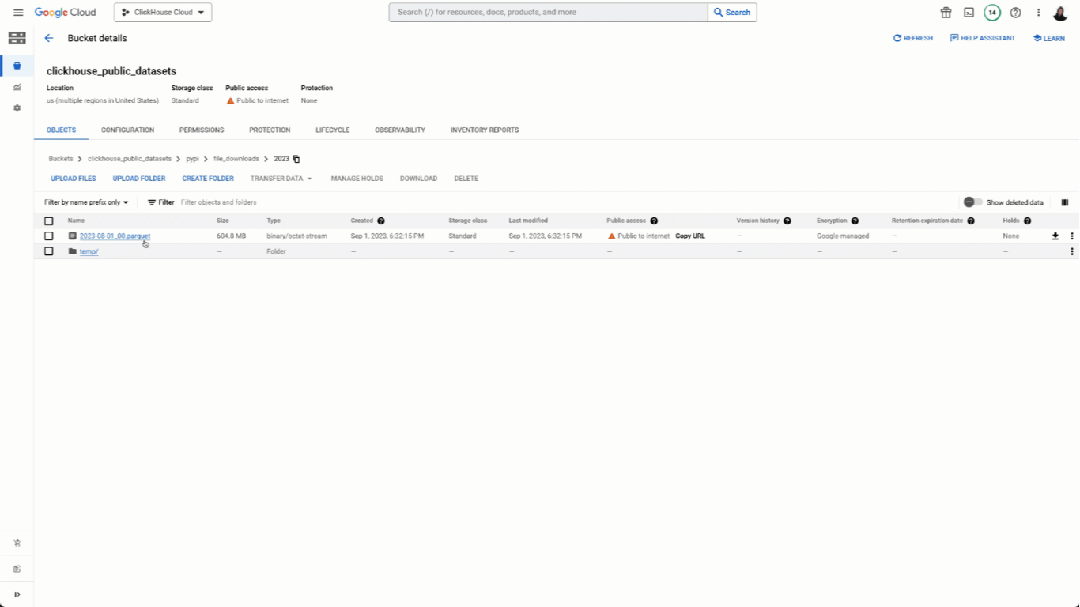 --23.7SELECTproject,count() AS cFROM s3('https://storage.googleapis.com/clickhouse_public_datasets/pypi/file_downloads/2023-07-31/*.parquet')WHERE (timestamp >= '2023-07-31 15:30:00') AND (timestamp <= '2023-08-31 16:00:00')GROUP BY projectORDER BY c DESCLIMIT 5┌─project────────────┬───────c─┐│ boto3 │ 9378319 ││ urllib3 │ 5343716 ││ requests │ 4749436 ││ botocore │ 4618614 ││ setuptools │ 4128870 │└────────────────────┴─────────┘5 rows in set. Elapsed: 83.644 sec. Processed 900.79 million rows, 134.94 GB (10.77 million rows/s., 1.61 GB/s.)--23.8SELECTproject,count() AS cFROM s3('https://storage.googleapis.com/clickhouse_public_datasets/pypi/file_downloads/2023-07-31/*.parquet')WHERE (timestamp >= '2023-07-31 15:30:00') AND (timestamp <= '2023-08-31 16:00:00')GROUP BY projectORDER BY c DESCLIMIT 55 rows in set. Elapsed: 34.993 sec. Processed 338.86 million rows, 51.17 GB (9.68 million rows/s., 1.46 GB/s.)Peak memory usage: 95.61 MiB.