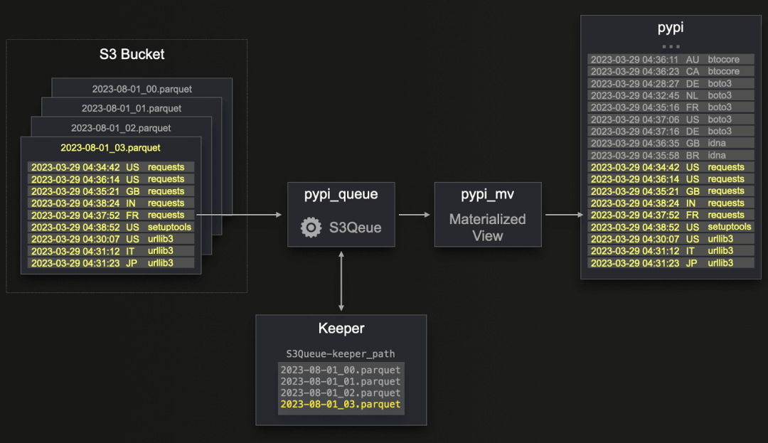 CREATE TABLE pypi_queueENGINE = S3Queue('https://storage.googleapis.com/clickhouse_public_datasets/pypi/file_downloads/2023/*.parquet')SETTINGS mode = 'unordered'CREATE TABLE pypiENGINE = MergeTreeORDER BY (project, timestamp)SETTINGS allow_nullable_key = 1 EMPTY ASSELECT *FROM pypi_queueCREATE MATERIALIZED VIEW pypi_mv TO pypi ASSELECT *FROM pypi_queueSELECT count()FROM pypi┌──count()─┐│ 39082124 │└──────────┘1 row in set. Elapsed: 0.003 sec.