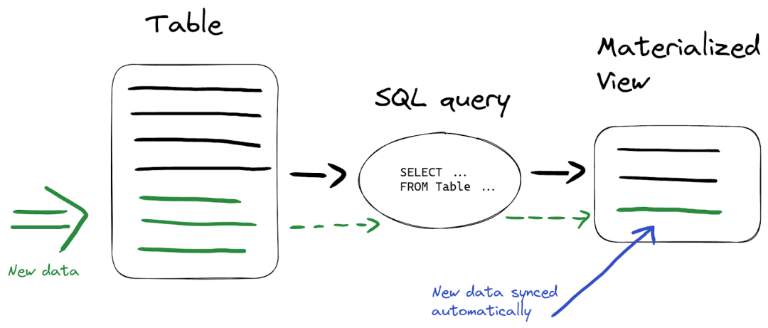 物化视图是一种特殊的触发器,当数据被插入时,它将数据上执行 SELECT 查询的结果存储为到一个目标表中: