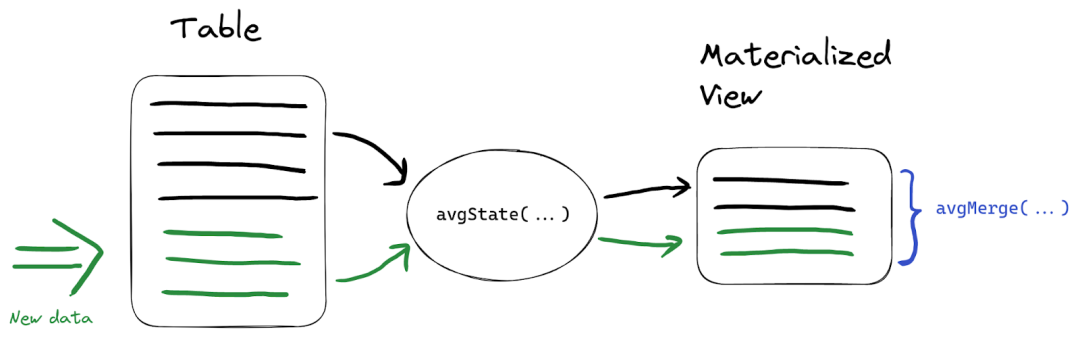 我们使用物化视图存储这些聚合结果以便更快地检索。使用状态组合器(state combinators)定义聚合结果。状态组合器要求ClickHouse保存内部聚合状态,而不是最终的聚合结果。这允许使用聚合操作,而无需保存带有原始值的所有记录。这种方法很简单 - 我们在创建物化视图时使用*State()函数,然后在查询时使用其对应的*Merge()函数获取正确的聚合结果: