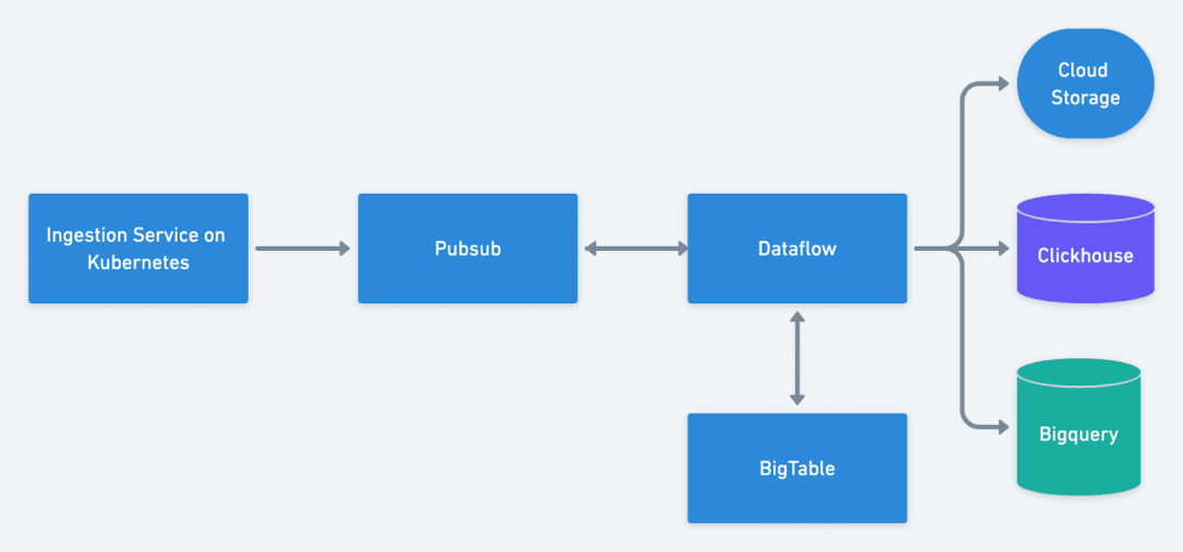 MessageBird的ClickHouse云架构集成了几种现代云技术。数据摄取层涉及一个从Google Pub/Sub将数据移动到ClickHouse的摄取服务,使用在Google Cloud Dataflow上运行的Apache Beam流水线。用于查找查询的数据存储在BigTable中,该存储提供低延迟和高吞吐量。MessageBird利用ClickHouse的CollapsingMergeTree表引擎的功能,确保只查询最新版本的行。