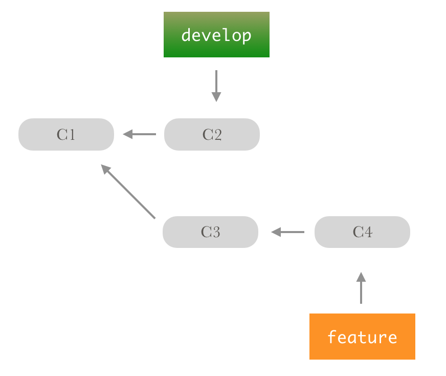 我第一次看也不理解,没关系,先来个小例子平静先,如下图所示,有两个分支,develop 和 feature,两个分支都有了各自的提交。