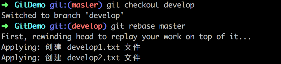 rebase 操作执行成功,现在 develop 分支指向的变基的最新提交,但是 master 分支的指针不变,仍然指向“master1 提交”,所以,如果需要,使用git merge master develop