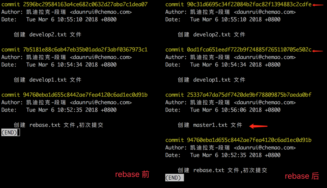 来看下 rebase 前后的 develop 的分支历史,如下图,左侧是 rebase 前,右侧是 rebase 后。