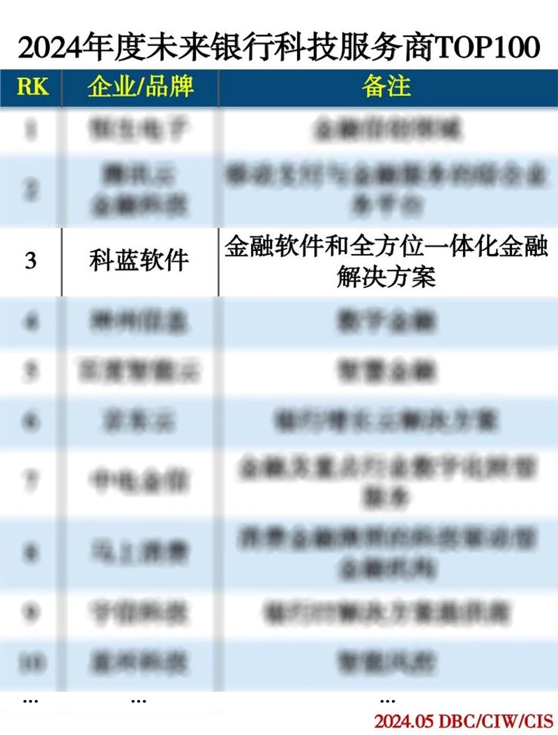 近日,由中国科学院《互联网周刊》、中国社会科学院信息化研究中心、eNet研究院、德本咨询联合发布的“2024年度未来银行科技服务商TOP100”排行榜发布,科蓝软件凭借其在银行数字化领域的强大技术实力、丰富行业经验以及卓越的产品与服务,在“2024年度未来银行科技服务商TOP100”榜单中脱颖而出,荣登第三名。