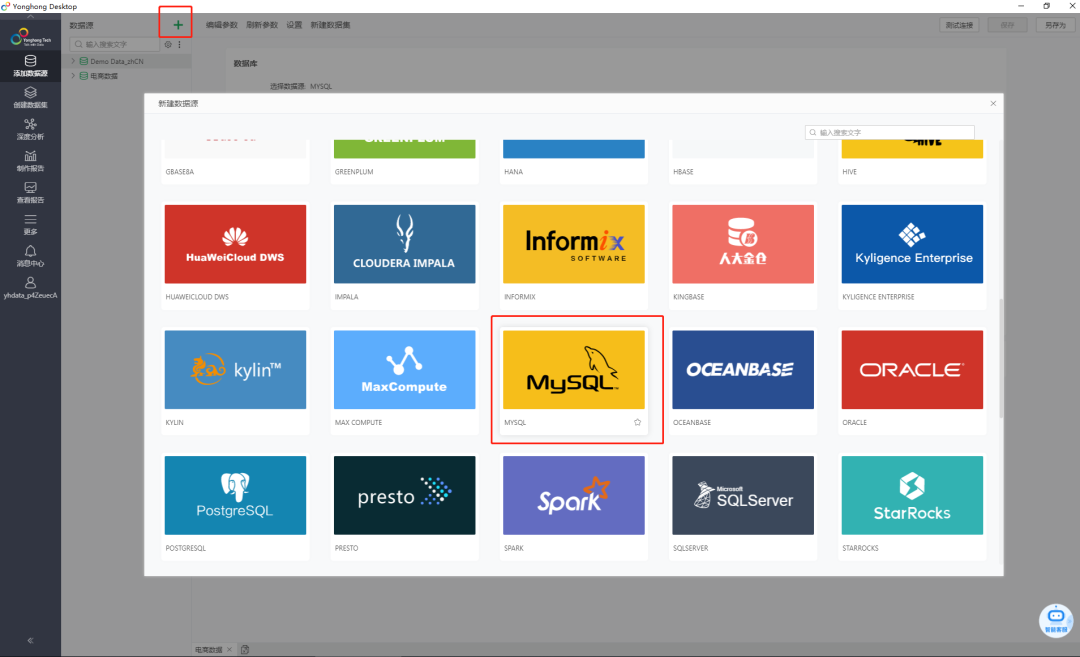 打开永洪 BI,选择左侧的添加数据源 > +(新建数据源),在弹出的数据库选项中选择 MySQL。
