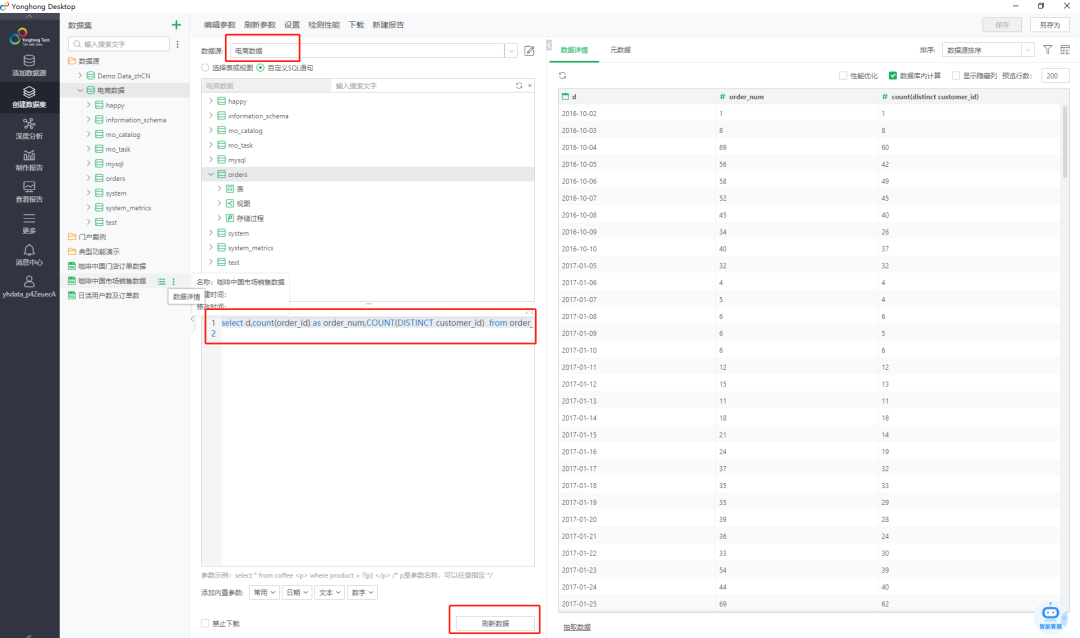 在永洪 BI 中,选择左侧的创建数据集菜单,然后选择刚刚添加的数据源。您将看到 MatrixOne 数据库中的表格和视图信息。根据您的业务需求,添加自定义 SQL,然后点击刷新数据。查询结果将显示在右侧,确认查询结果是否符合预期后,点击保存以保存数据集。