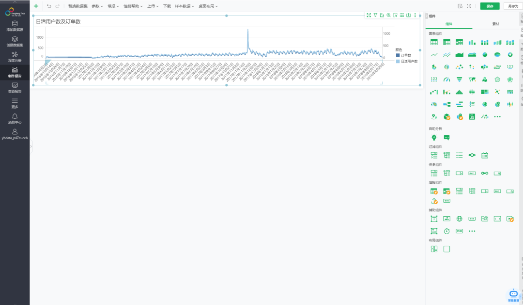 选择刚刚创建的数据集,将时间维度设置为 X 轴,将日订单数和活跃用户数设置为 Y 轴。您可以将度量和维度字段根据需要拖动到相应的位置。编辑完成后,点击保存以保存刚刚制作的报告。