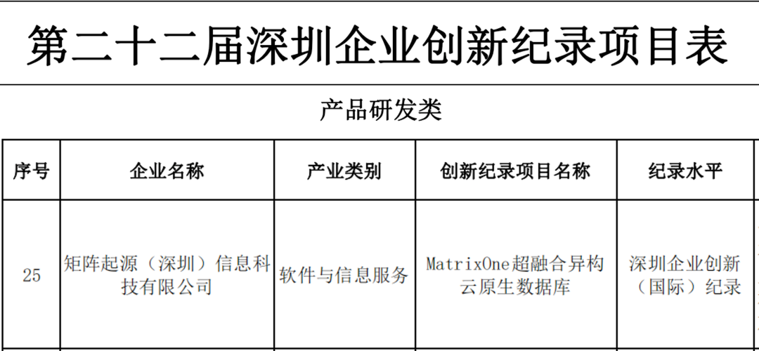 近期,第二十二届“深圳企业创新纪录”结果已经公示,矩阵起源凭借 MatrixOne 新一代超融合云原生异构数据库产品,荣获"深圳企业创新(国际)纪录"殊荣!