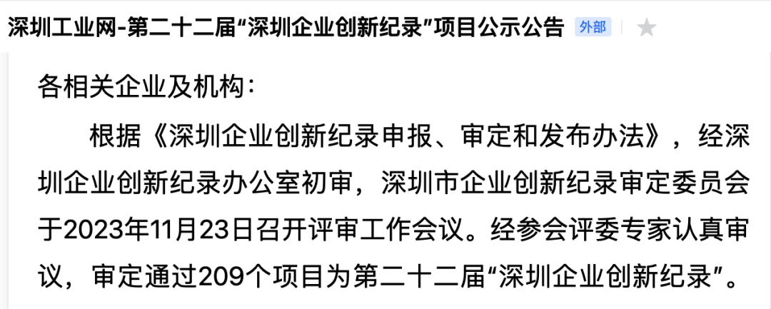 为深入贯彻党的二十大关于“必须坚持科技是第一生产力、人才是第一资源、创新是第一动力”、“加快实现高水平科技自立自强”的发展战略,在新发展阶段推动企业高质量发展,深圳市企业创新纪录组织委员会于2023年3月组织开展第二十二届“深圳企业创新纪录”审定发布活动,并于11月23日召开审定会议并完成审定。