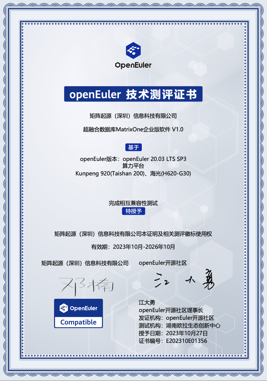 近日,超融合异构云原生数据库MatrixOne企业版软件V1.0完成了与欧拉开源操作系统(openEuler简称“欧拉”)、麒麟信安操作系统系列产品和虚拟化平台的相互兼容认证,通过了欧拉兼容性测评,获得了《openEuler技术测评证书》和麒麟信安《产品兼容性认证证书》。测试期间,整体运行稳定,在功能、性能及兼容性方面表现良好。