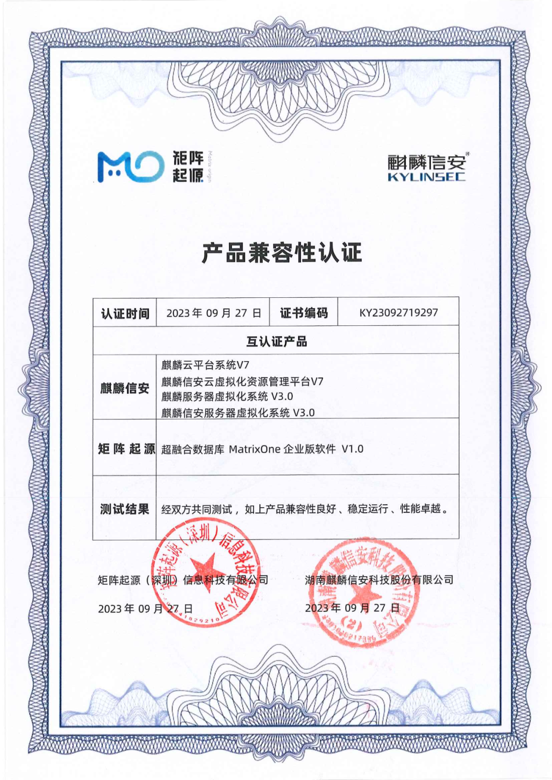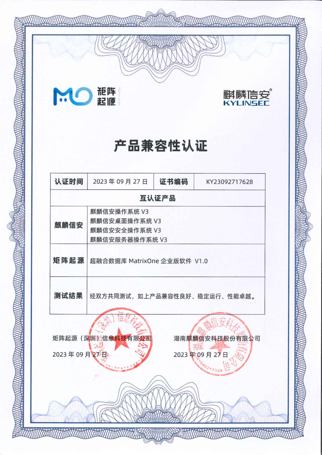 经过以上多项测试表明,MatrixOne 企业版软件 V1.0 与openEuler、麒麟信安操作系统的相互兼容认证,测试期间,整体运行稳定,在功能、性能及兼容性方面表现良好。