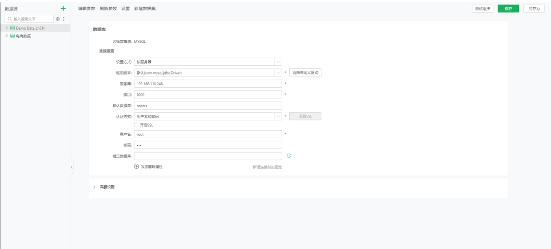 MatrixOne本次针对Superset、FineBI和永洪BI进行了首轮的适配,当我们在使用上述BI工具连接MatrixOne时,可以直接选择MySQL连接器,将MatrixOne视为MySQL进行连接访问,来对用户的数据可视化场景提供有效支撑。下图为永洪BI使用MySQL数据源连接示例: