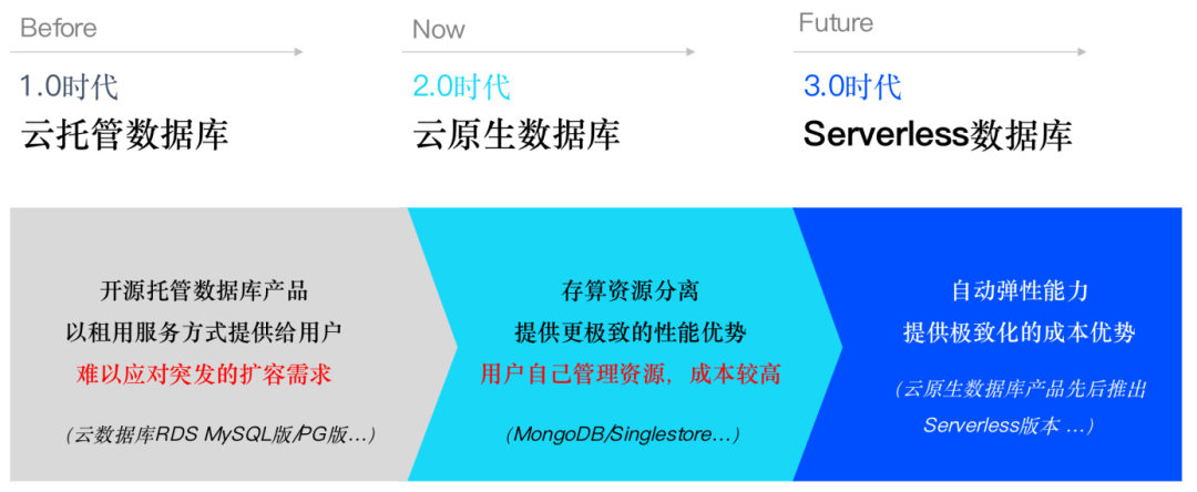 公有云数据库发展至今经历了云托管、云原生和 Serverless 三个时代。