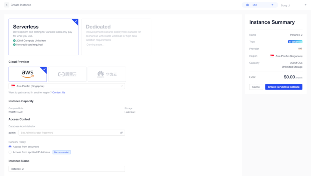 MatrixOne Cloud (MO Cloud) 支持创建 Serverless 数据库实例,并可以做到完全对用户屏蔽机器资源。实际操作中,用户仅需为实际执行的 SQL 以及数据存储的大小付费。
