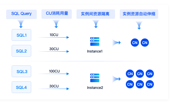 以 CU(Compute Unit)为计量单位,按 SQL 实际消耗的 CU 数计费,用户仅需关注 SQL 本身;实例可以感知业务变化快速扩缩容资源,在高并发场景下也可以享受到极致性能,并且实例间资源相互隔离,SQL 性能互不影响。