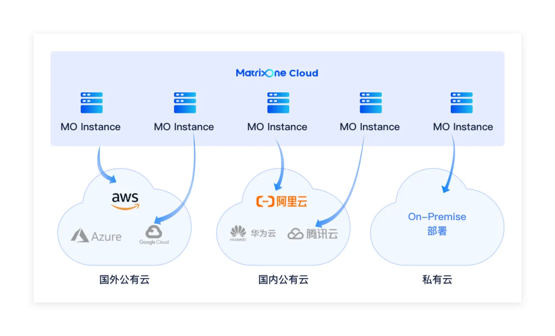 MO Cloud 的实例支持跨公有云 DaaS 服务,满足多应用的不同地域访问需要,异构云原生技术架构,支持公有云和 On-Premise 混合部署,提供统一的部署和管控方案。