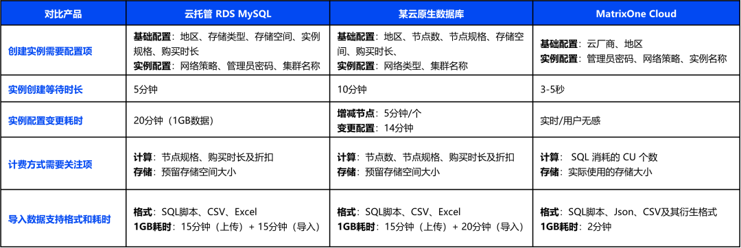 以 TPC-H 应用场景为例,我们现场对比了某公有云的云托管数据库、云原生数据库和 MO Cloud Serverless 实例的操作体验,发现 MO Cloud 在实例的创建和资源变配等方面更加简单和迅速,计费方式更简单。