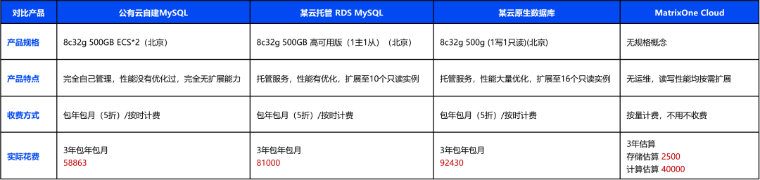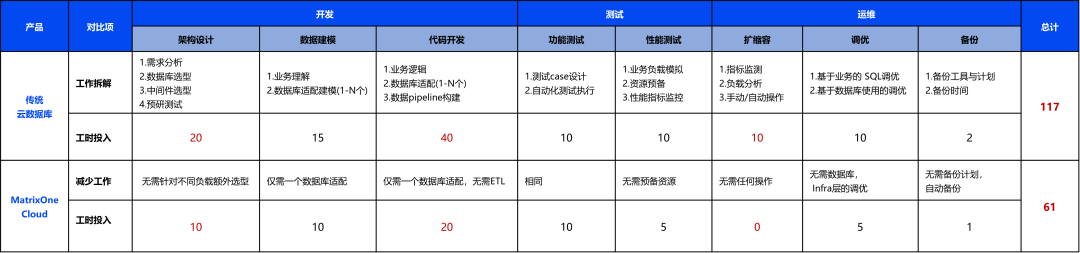 MO Cloud Serverless 实例在人力投入成本上也更加便宜。以需要一定报表能力的小型管理系统为例,我们演算了传统云数据库和 MO Cloud 的综合人力投入对比。