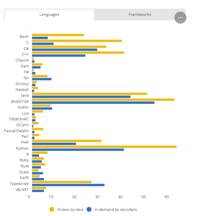 报告指出,与往年一样,编程语言方面JavaScript、Java和Python仍然是需求最高的技能;且在大多数情况下,开发人员和招聘人员之间对这三种最流行的语言的需求和供应是一致的。对TypeScript、Swift、Scala、Kotlin和Go技能的需求则都超过了供应。