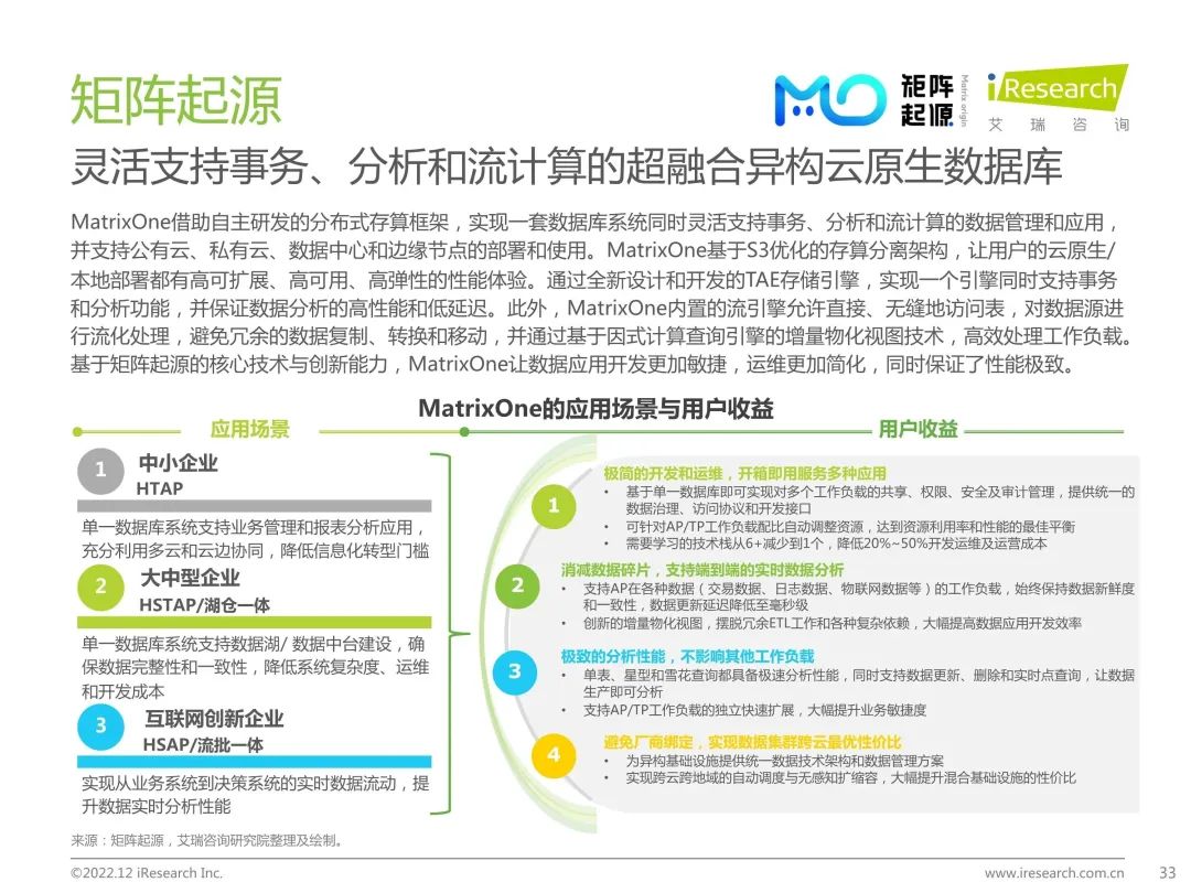 其中,MatrixOne入选报告专题研究。MatrixOne借助自主研发的分布式存算框架,实现一套数据库系统同时灵活支持事务、分析和流计算的数据管理和应用,并支持公有云、私有云、数据中心和边缘节点的部署和使用。MatrixOne基于S3优化的存算分离架构,让用户的云原生/本地部署都有高可扩展、高可用、高弹性的性能体验。通过全新设计和开发的TAE存储引擎,实现一个引擎同时支持事务和分析功能,并保证数据分析的高性能和低延迟。