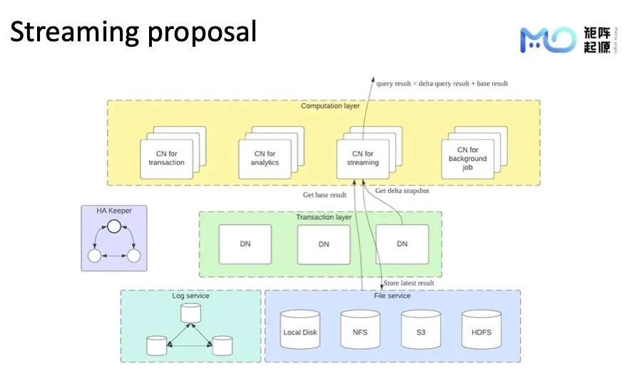 另一个方式是定期地、在用户做streaming查询时从CN节点拉取base result、拉取delta snapshot,再做增量查询。查询结束后把最新的base result存储到S3、HDFS等可靠存储上,下次做增量计算时可以用到存储的base result。