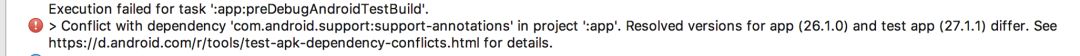 从报错信息中,得知是冲突原因是 support-annotations 有两个版本, 26.1.0 和 27.1.1 。