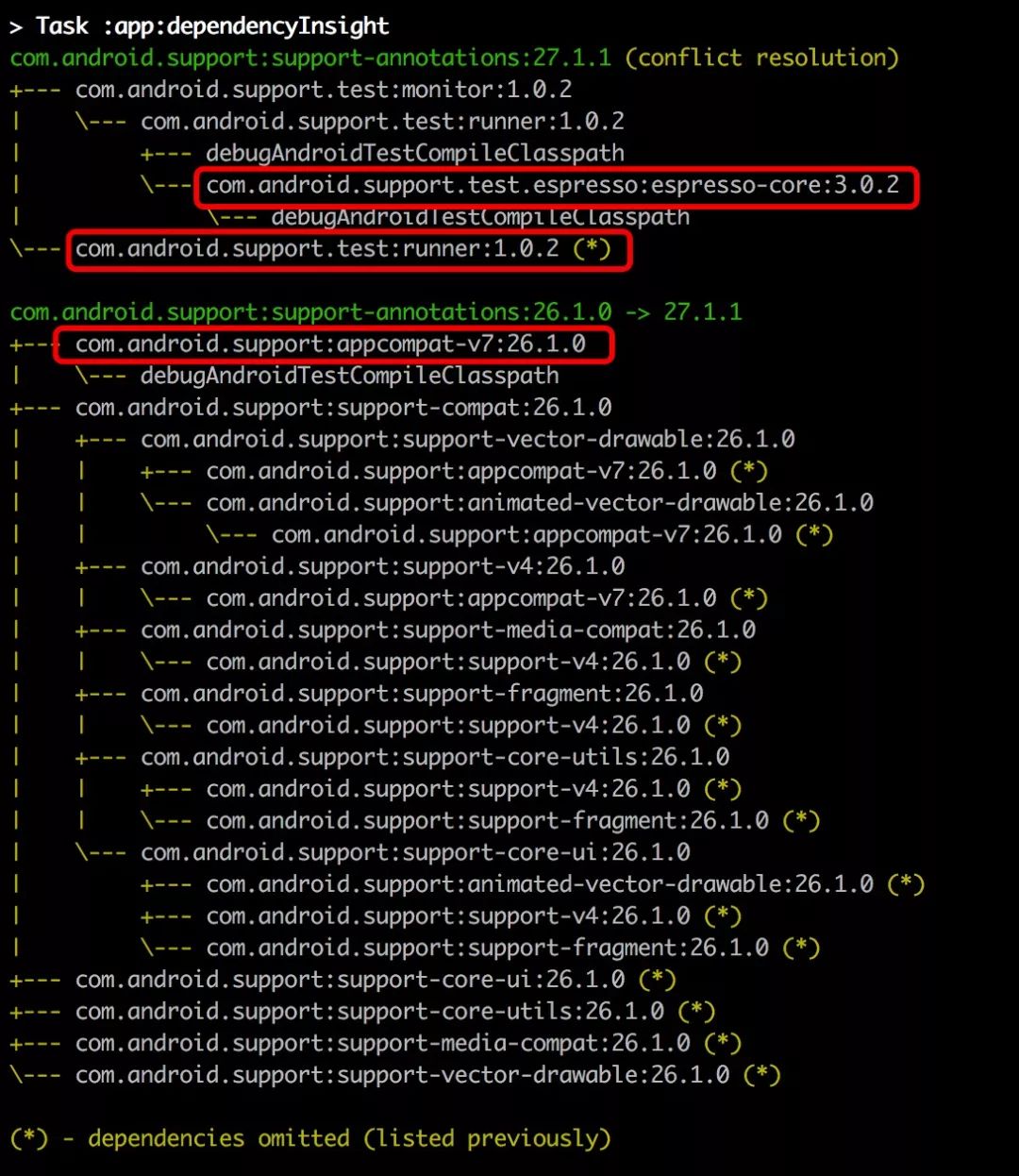 对于以上问题,处理 AS 爆红的多年经验告诉我,需要打印项目的依赖树的时候到了!